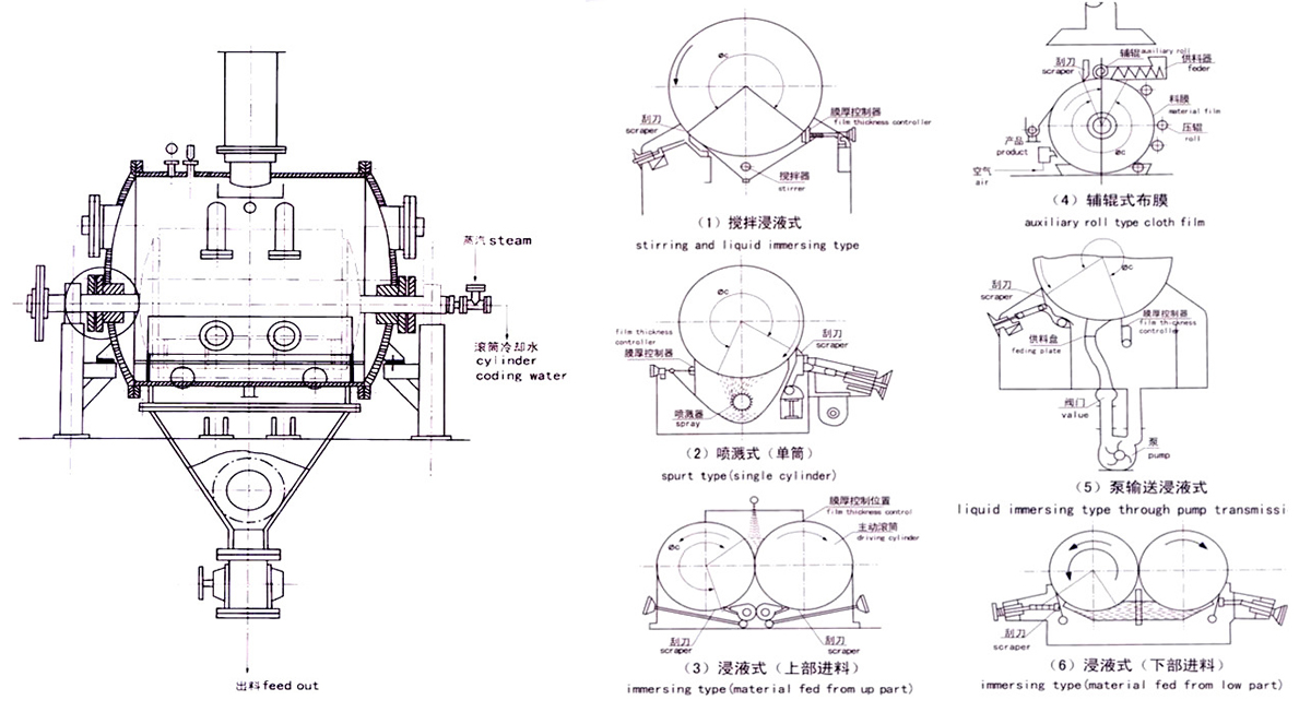 滾筒刮板干燥機(jī)是一種內(nèi)加熱傳導(dǎo)型轉(zhuǎn)動干燥設(shè)備,濕物料在滾筒外壁上獲得以導(dǎo)熱方式傳遞的熱量,脫除水份,達(dá)到所要求的濕水含量.熱量由筒內(nèi)壁傳到筒外壁,再穿過料膜,其熱效率高,可連續(xù)操作,故廣泛應(yīng)用于液態(tài)物料或帶狀物料的干燥,對膏狀和粘稠物料更適用。